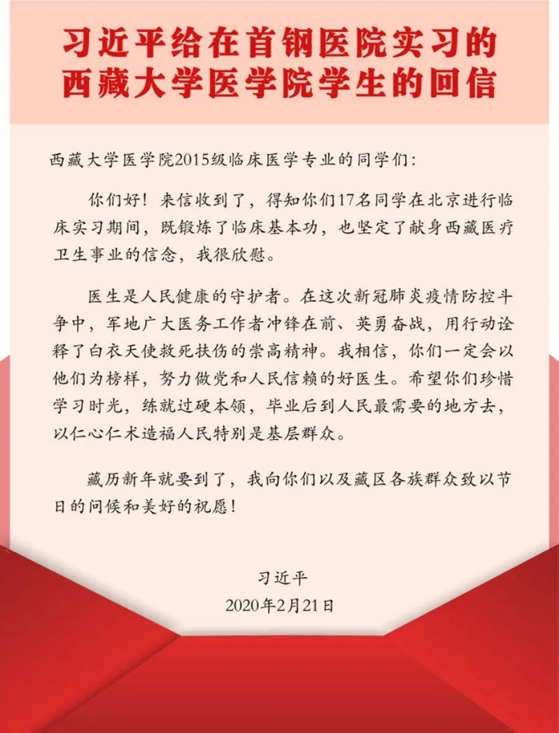 副院长时国松谈到,习总书记的回信内容饱含热情、语重心长,充分展示中央对西藏卫生事业的重视,尤其是在举国抗疫的全国环境下,意义非凡。作为教育事业的普通工作者,要深刻领悟回信精神,把工作落到实处,把学生培养成本领过硬、造福人民群众、合格的社会主义事业接班人,引导毕业生到人民需要的地方去,为社会主义事业作出更大的贡献。