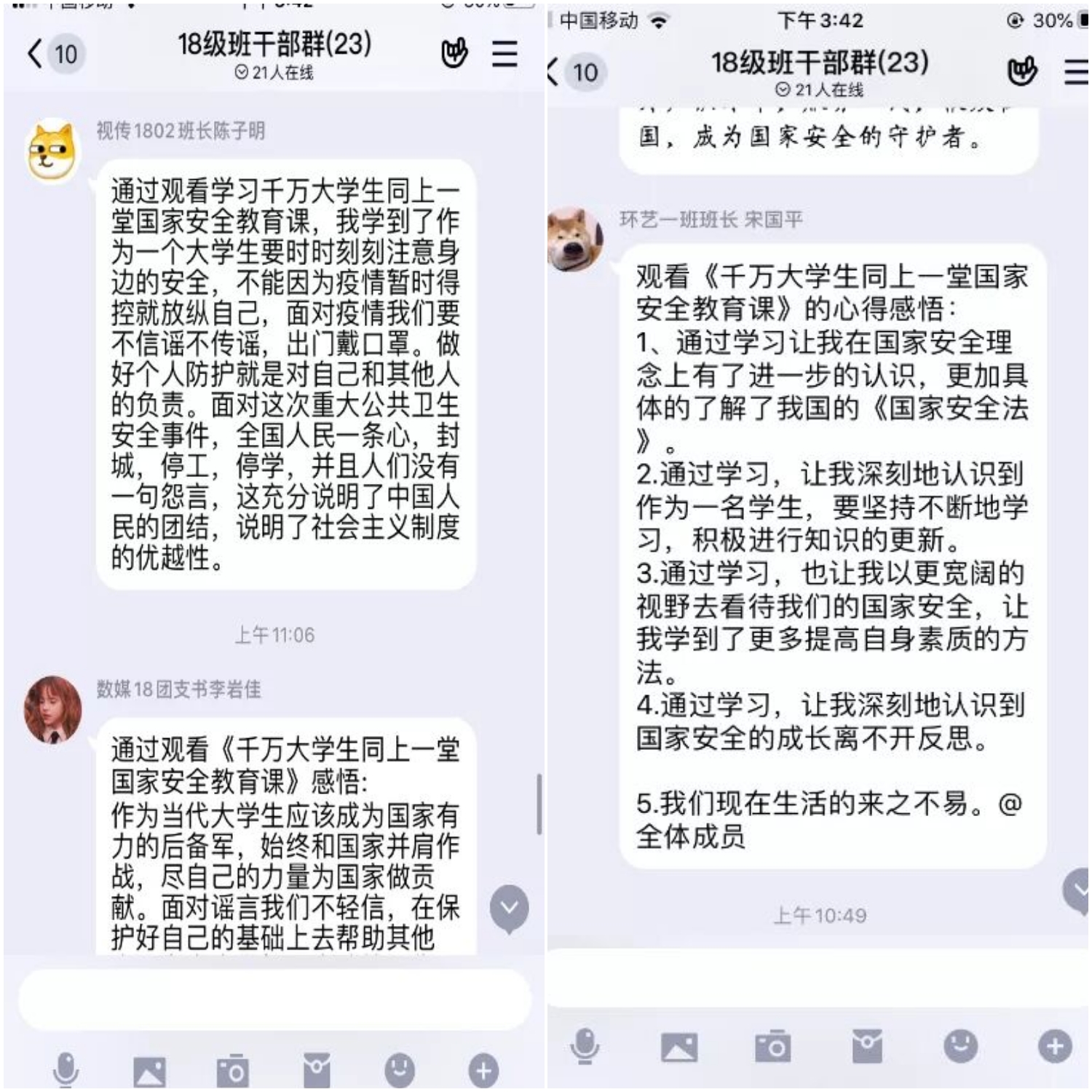 4月15日是国家安全教育日,为培养和增强当代大学生自觉维护国家安全的责任感和使命感,进一步增强大学生维护国家安全的意识。太阳官网艺术学院组织各班级、班干部通过群组讨论的方式线上观看《千万大学生同上一堂国家安全教育课》,并进行交流发表各自感悟。