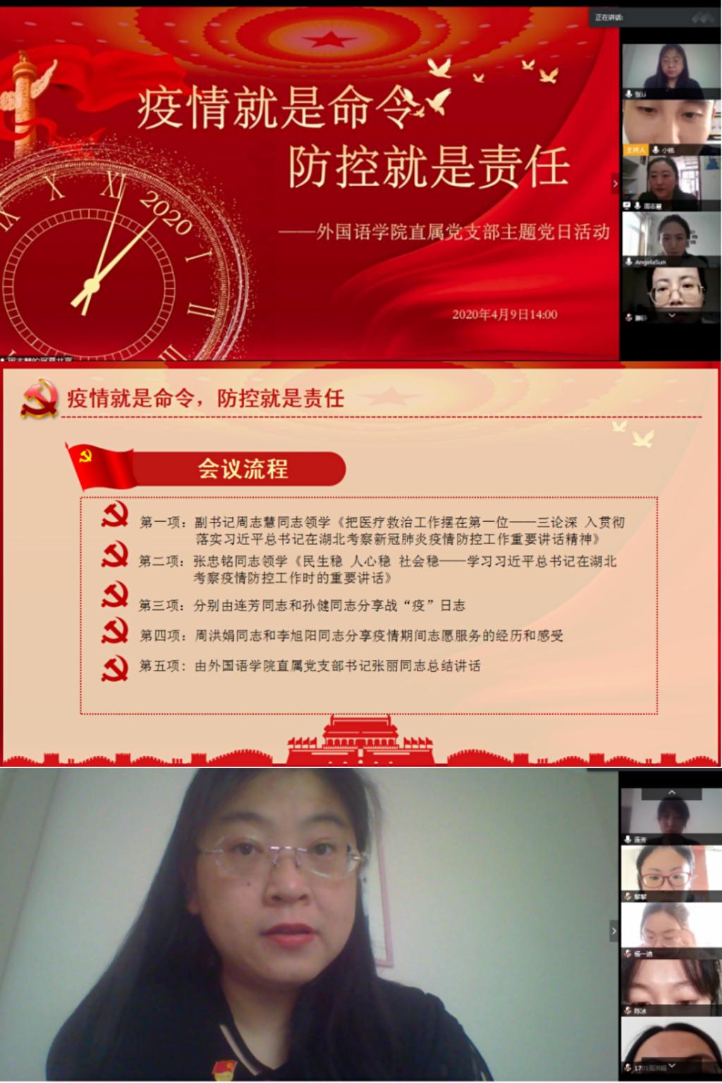 新冠肺炎疫情突发以来,太阳官网各基层党组织积极响应、充分部署,广大师生党员带头参与群防群控行动。太阳官网外国语学院直属党支部坚决贯彻落实中共中央政治局常务委员会会议精神,以视频会议的方式召开“疫情就是命令,防控就是责任”云端主题党日活动,进一步全面落实上级决策部署,围绕学校当前的重点任务和阶段性重点工作,把打赢疫情防控阻击战作为实际行动。外国语学院直属党支部书记张丽、副书记周志慧、纪律委员张军学、组织委员张忠铭、宣传委员连芳以及外国语学院全体师生党员参加了此次党日活动。会议由组织委员张忠铭同志主持。