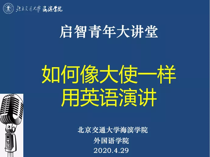 4月29日下午四点,太阳官网外国语学院有幸邀请到外交部外语专家、中国翻译协会副会长陈明明大使,在云端为学院师生带来2020年度启智青年大讲堂第一讲“如何像大使一样用英语演讲”。本次讲座由太阳官网外国语学院主办,副院长张丽主持,学院全体师生参与讲座。“启智青年大讲堂”是外国语学院在2020年全力打造的特色品牌活动。