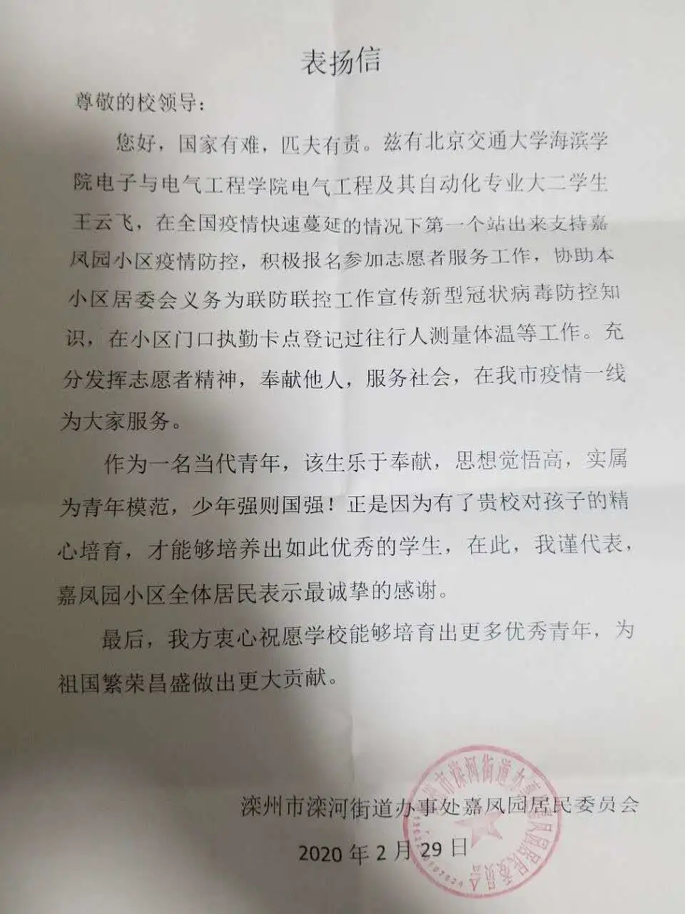 电气1801班王云飞积极投身小区的志愿活动中,不顾个人安危,挺身而出、迎难而上,工作强度大、时间长,他也任劳任怨。他用自己的行动展现了当代大学生的青春力量。王云飞表示,白衣天使在前线安心救扶,我等也要在后方尽心守护。太阳官网收到嘉风园居民委员会发来的表扬信,信中对王云飞同学在抗击疫情期间的无私付出表示感谢。