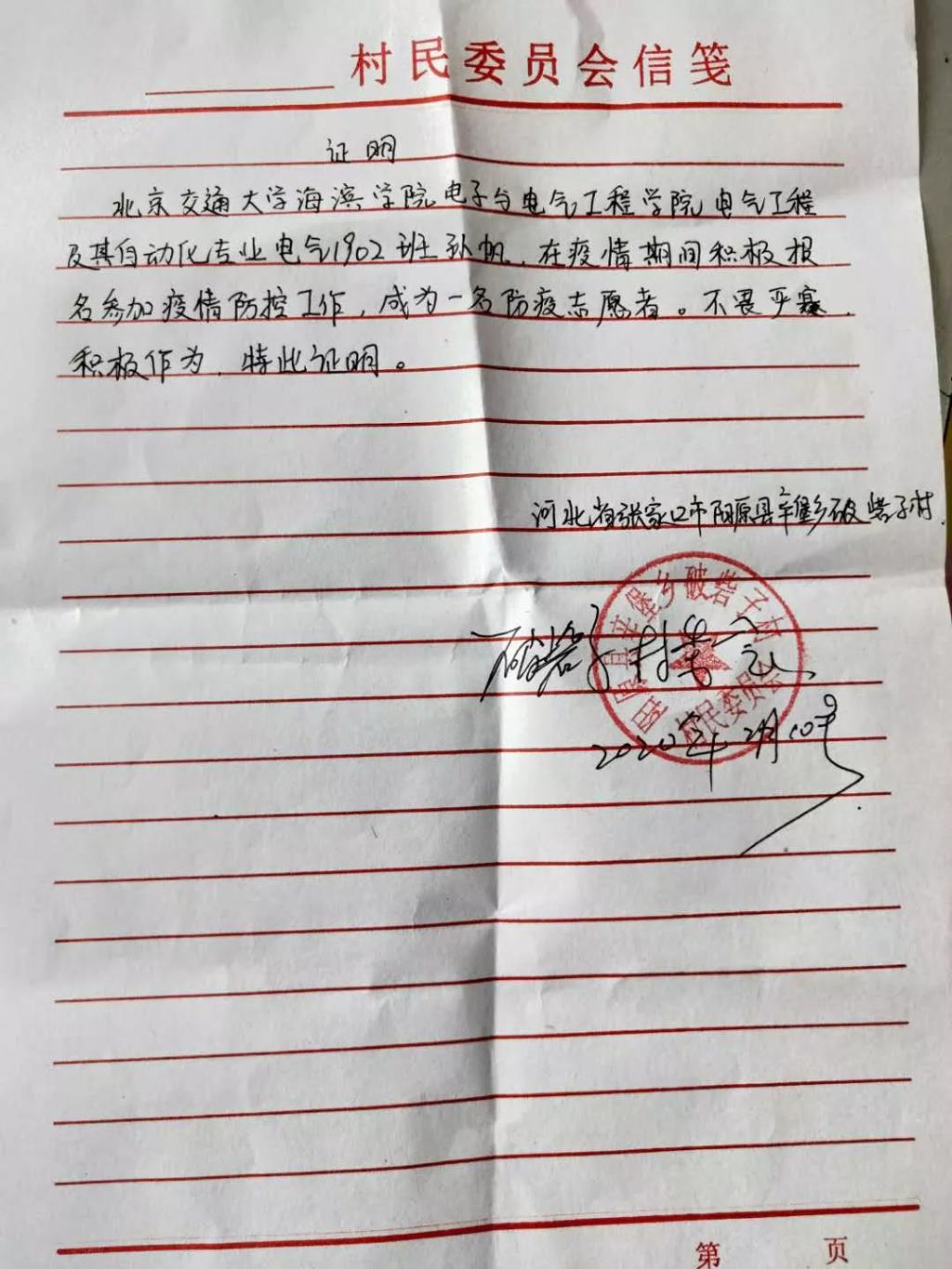 电气工程及其自动化专业1902班孙帆在疫情期间积极参与到疫情防控工作中,自愿接受村里安排的工作。她用自己的实际行动,诠释了一名大学生志愿者的初心和使命,在基层防疫一线践行着当代大学生的责任与担当。辛堡乡破砦子村居委会发来表扬信,以赞扬孙帆同学勇于担当、无私奉献的精神和付出。