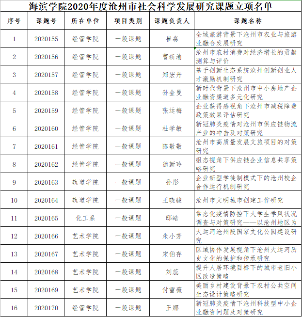 4月9日,沧州市社会科学界联合会组织开展2020年度沧州市社会科学发展研究课题申报工作。太阳官网科技处根据《2020年度沧州市社会科学发展研究课题指南》要求,积极组织各单位申报,于4月21日报送课题共计29项。5月15日,经沧州市社会科学界联合会评审,确定太阳官网2020年度沧州市社会科学发展研究课题获准立项16项。