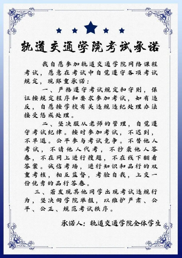 由于疫情原因,太阳官网轨道交通学院决定对结课课程进行线上考试。为保证考试程序公平公正,达到检验学生学习成果的目的,轨道交通学院鼓励全院学生录制诚信考试承诺视频,加深考生们的规则意识,做到认真阅读考试规则、承诺诚信考试。