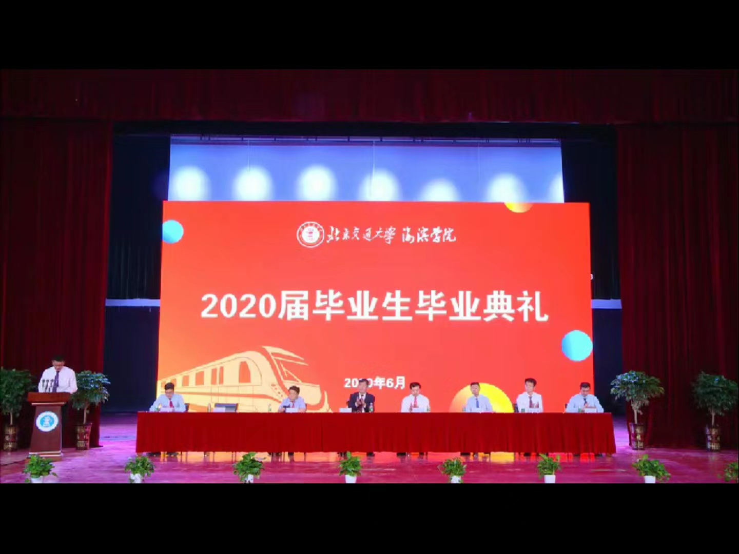 北京交通大学党委常委、副校长赵鹏,黄骅市人民政府副市长张桂云,北京交通大学海滨学院董事长薛行远线上出席本次典礼;北京交通大学海滨学院院长王化深,党委书记、副院长魏旺强,常务副院长、副书记张长铎,党委副书记魏炜,副院长赵金楼,院长助理邵晓康,院长助理吴立军,人才办公室主任任虹宇现场出席典礼;学院各院系、党政职能部门相关负责人,毕业生辅导员、教师代表参加典礼,与此同时,学校2020届毕业生“云端”观看本次毕业典礼。