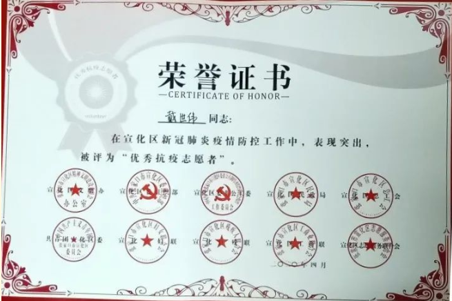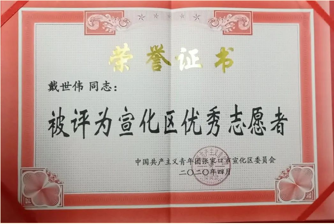 在疫情防控期间,土木建筑工程学院工程造价1802戴世伟同学就积极参与到当地的志愿者活动中,通过志愿汇APP加入到张家口市爱心公益促进会,并积极响应宣化区团委志愿者招募的号召,加入张家口市宣化区团委创立的“青葡”志愿者团队,成为抗疫志愿者,正式开展志愿服务工作。他先后协助社区进行市内外返宣人员登记、大东村出入证发放、张贴疫情宣传资料、参与西城社区二轮入户排查登记等工作,在永欣小区、钢鑫小区、94号院等小区进行防疫值守与人员车辆出入信息登记,同时利用微信、QQ以及微博等软件宣传志愿服务与防疫知识。在志愿服务过程中,身为新时代土建学子戴世伟,因自己能够为家乡贡献一份力量,将学校的优良教育付诸实践,他感到无比的骄傲。