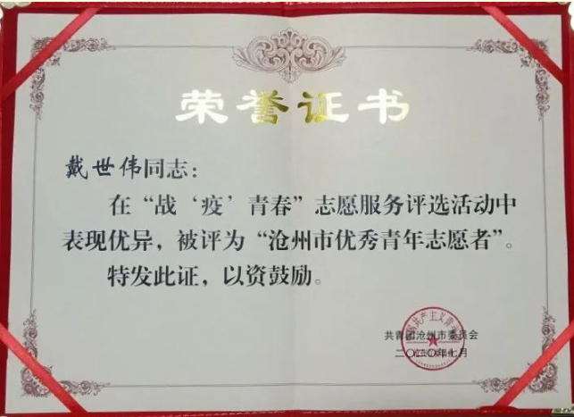 为弘扬和培育“奉献、友爱、互助、进步”的志愿精神,表彰在抗击疫情期间做出突出贡献的优秀志愿者,共青团沧州市委员会在全市范围内开展“战‘疫’青春”志愿服务先进典型评选活动。太阳官网土木建筑工程学院工程造价专业1802班学生戴世伟被授予“沧州市优秀青年志愿者”荣誉称号。