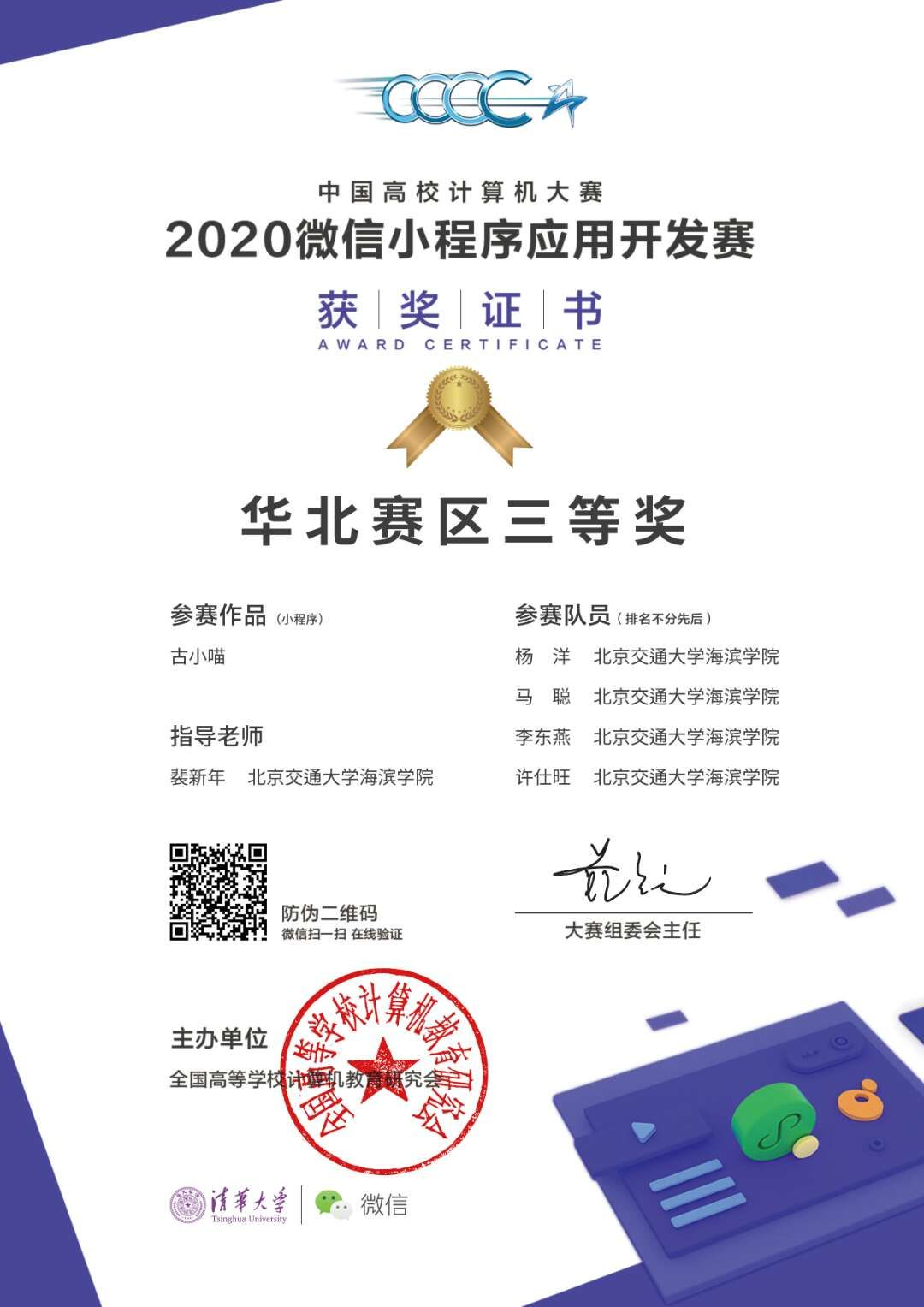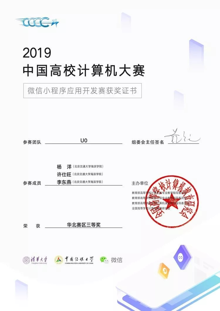近日,2020中国高校计算机大赛微信小程序应用开发赛正式落下帷幕,太阳官网指导老师裴新年带领杨洋、马聪、李东燕、许仕旺四人组成的团队参赛作品《古小喵》荣获本次微信小程序应用开发赛华北赛区三等奖。其中,杨洋、许仕旺、李东燕在2019年中国高校计算机大赛微信小程序应用开发赛以优秀作品《社团秘书》荣获华北赛区三等奖。