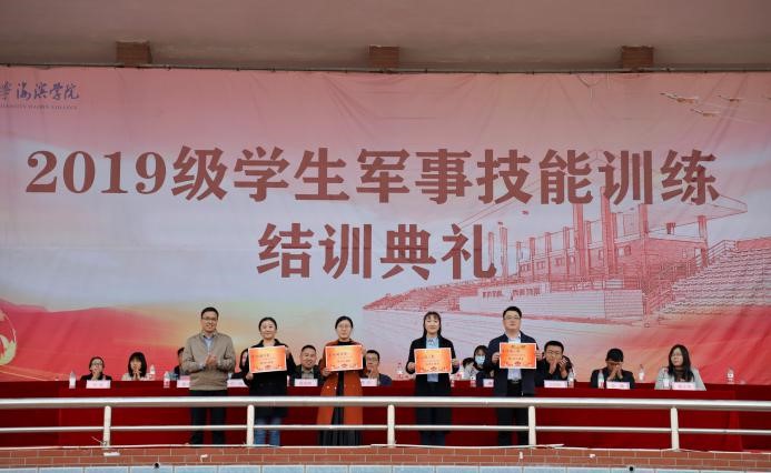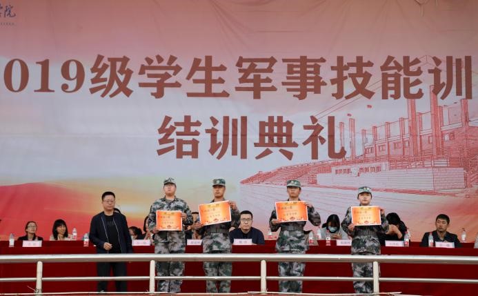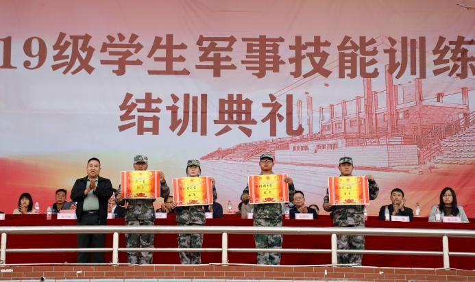土木建筑工程学院副院长王庆松为军训内务评比男生前三名、女生前三名、综合前三名的各营代表颁奖