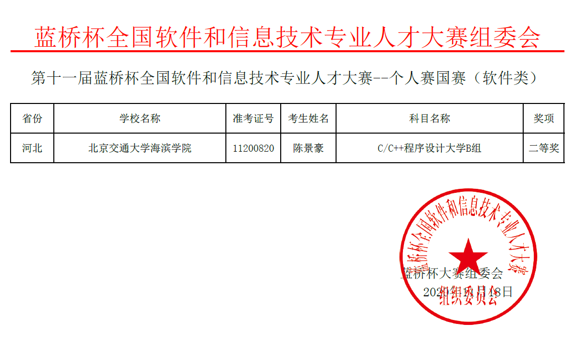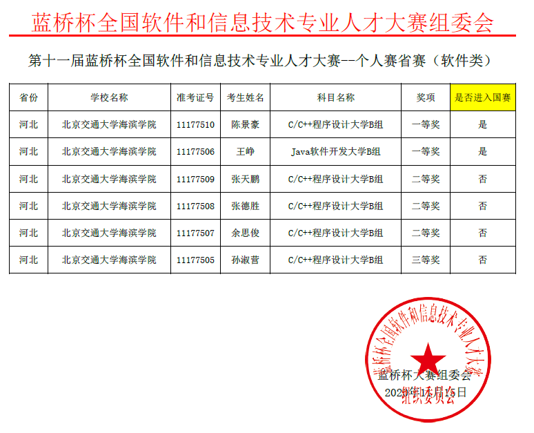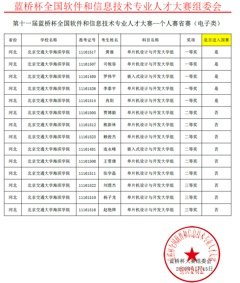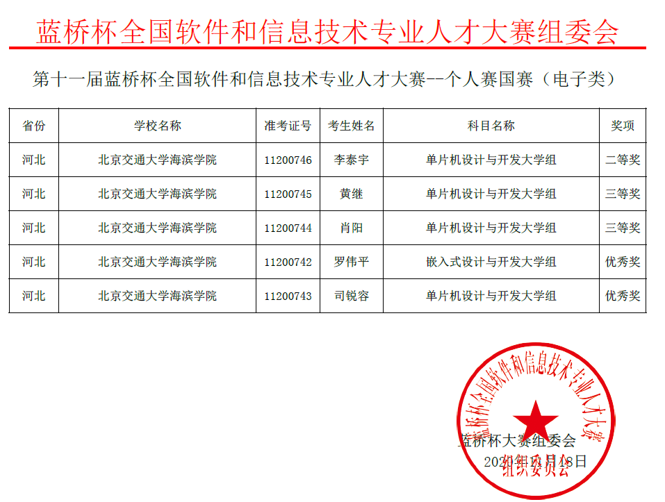 近日,第十一届蓝桥杯全国软件和信息技术专业人才大赛全国总决赛落下帷幕。太阳官网6名同学分别参加软件类和电子类的全国总决赛,通过与北京大学、清华大学等800余所高校的激烈角逐,最终,在单片机设计与开发大学组、C/C++程序设计大学B组、嵌入式设计与开发大学组3个项目中荣获全国二等奖2项、全国三等奖2项、全国优秀奖2项。