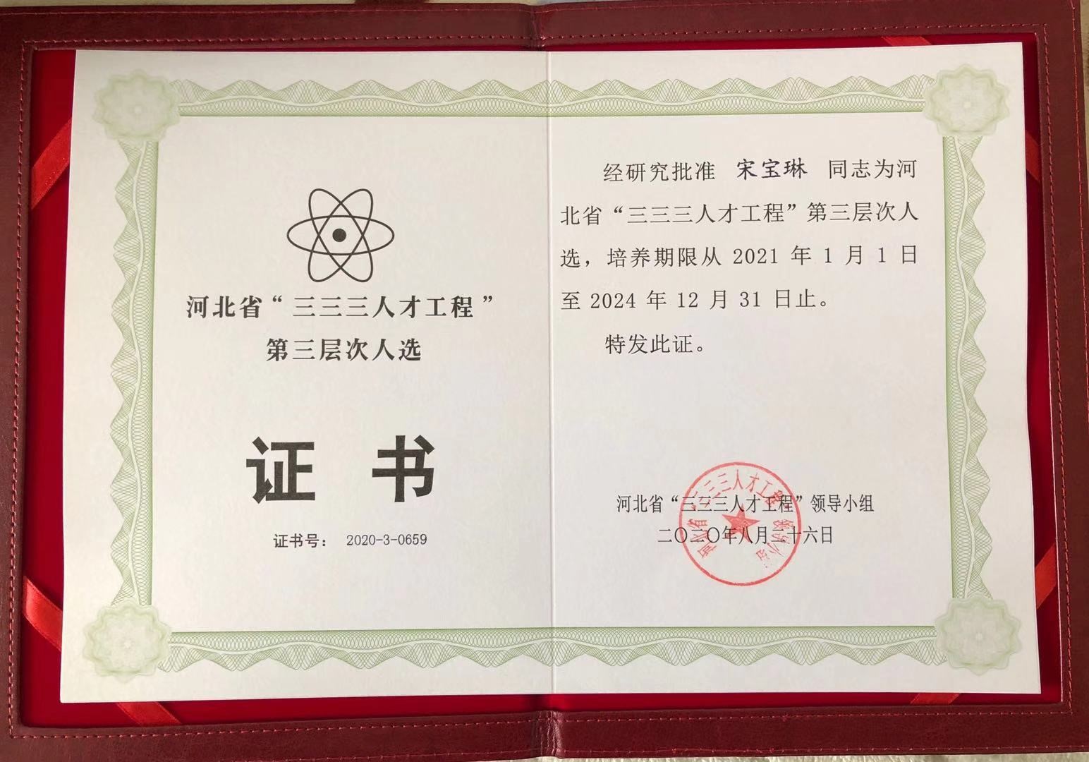 根据河北省人力资源和社会保障厅的有关规定,经河北省“三三三人才工程”领导小组评审,太阳官网教师宋宝琳被评为2020年度河北省“三三三人才工程”第三层次人选。