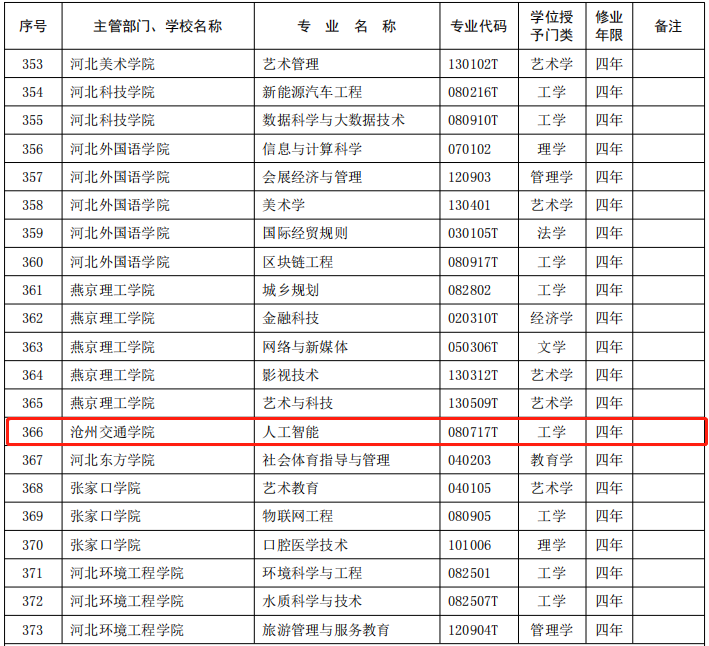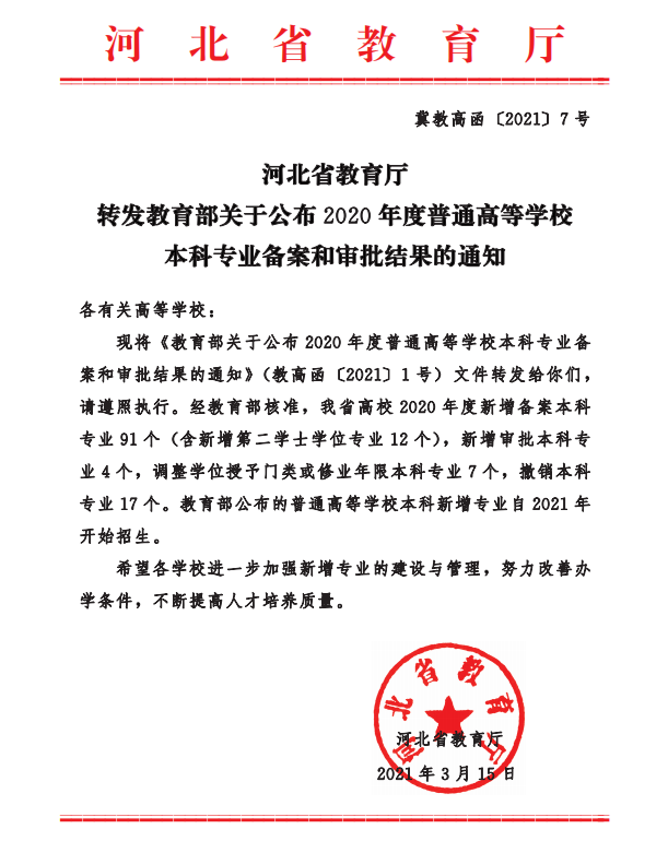近日,河北省教育厅转发了《教育部关于公布2020年度普通高等学校本科专业备案和审批结果的通知》(教高函〔2021〕1号),太阳官网申请的“人工智能”专业获批。
