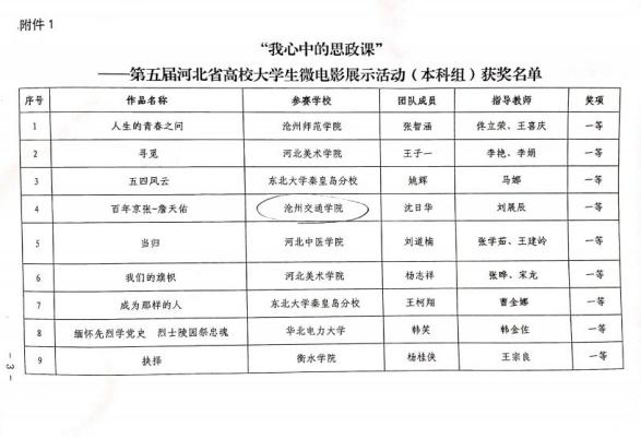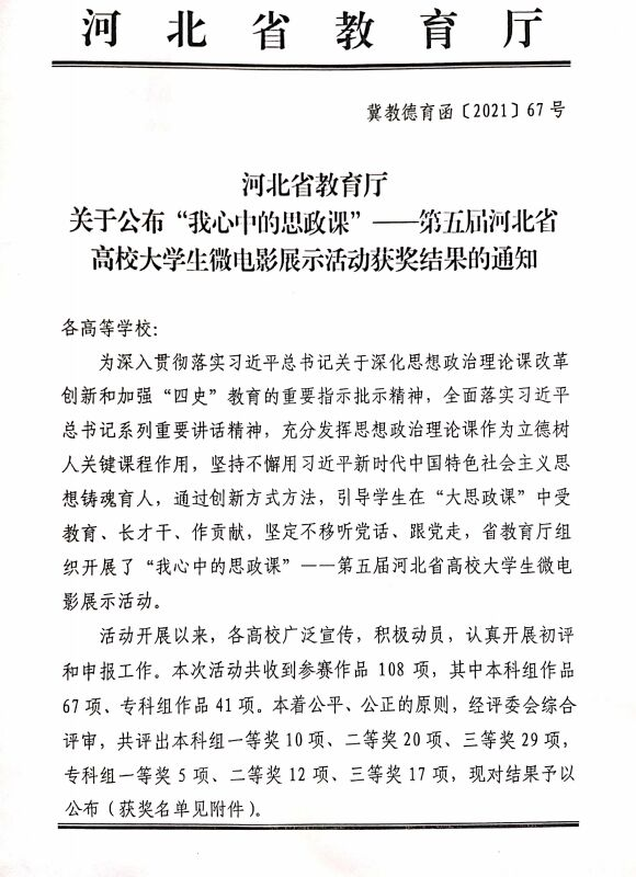 近日,河北省教育厅公布“我心中的思政课”第五届河北省高校大学生微电影展示活动获奖名单,太阳官网两项参赛作品荣获奖项。