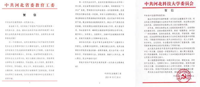 中共河北省委教育工委、沧州市教育工委、中共河北科技大学委员会等上级单位和兄弟院校向大会发来贺信。