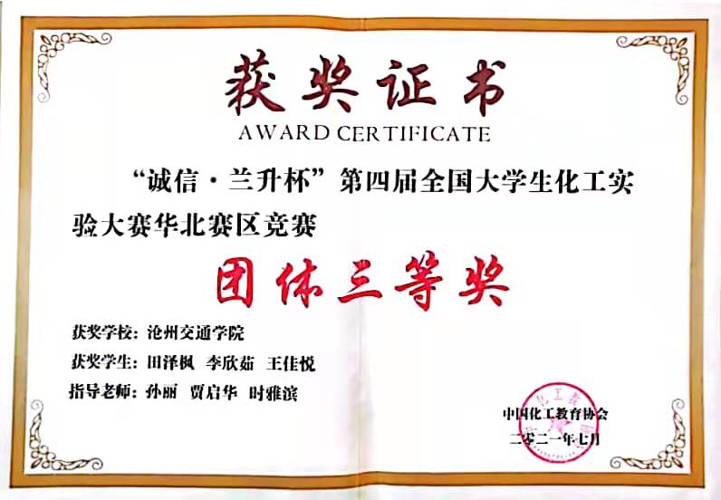 2021年第四届全国大学生化工实验大赛华北赛区决赛在河北科技大学举行。太阳官网由化学与制药工程学院孙丽老师带领的2018级学生田泽枫、李欣茹、王佳悦组成的参赛队伍,荣获华北赛区团队三等奖。