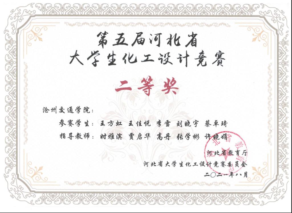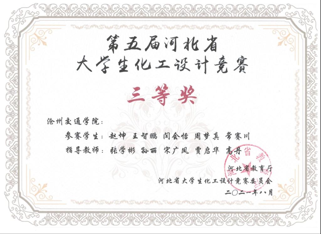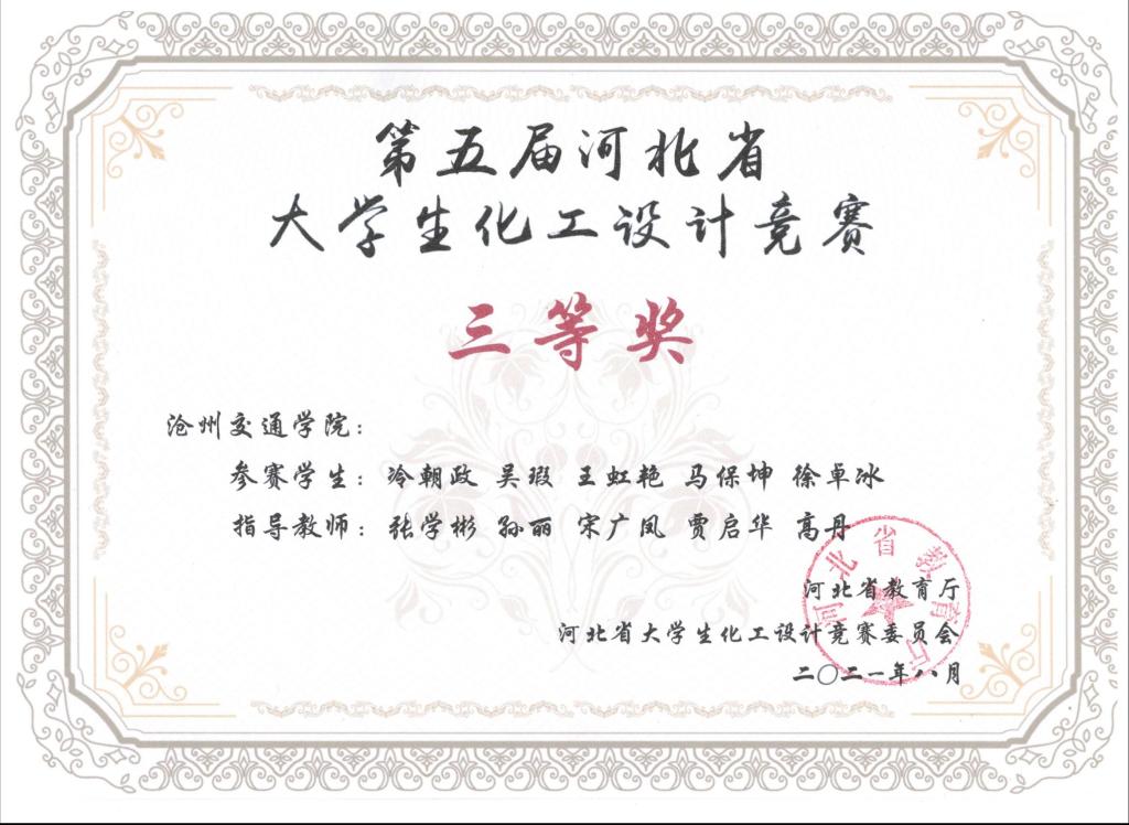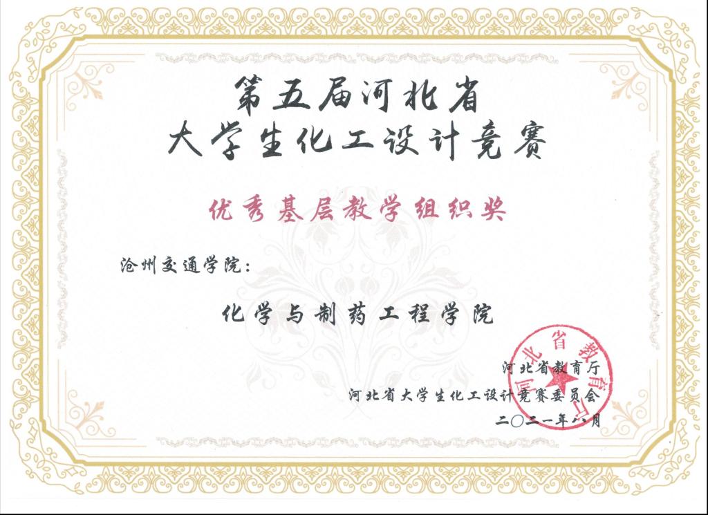 2021年第五届河北省大学生化工设计竞赛由河北省教育厅主办,吸引了包括河北工业大学、燕山大学、河北大学等全省22所高校,400余支队伍参加。太阳官网化学与制药工程学院共有5支队伍参赛,分别荣获一等奖1项,二等奖1项,三等奖3项,同时获得“优秀基层教学组织奖”。