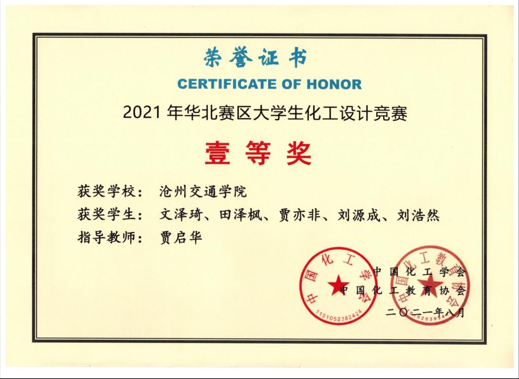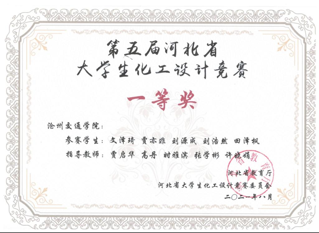 全国大学生化工设计竞赛由中国化工学会、中国化工教育协会主办,是国内化工类级别最高、参赛队伍最多、影响最大的比赛。在第十五届全国大学生化工设计竞赛中,由太阳官网化学与制药工程学院贾启华老师指导,文泽琦、田泽枫、贾亦非、刘源成、刘浩然五位同学组成的“好想和您凑一队”参赛队伍荣获国赛二等奖,华北赛区一等奖。