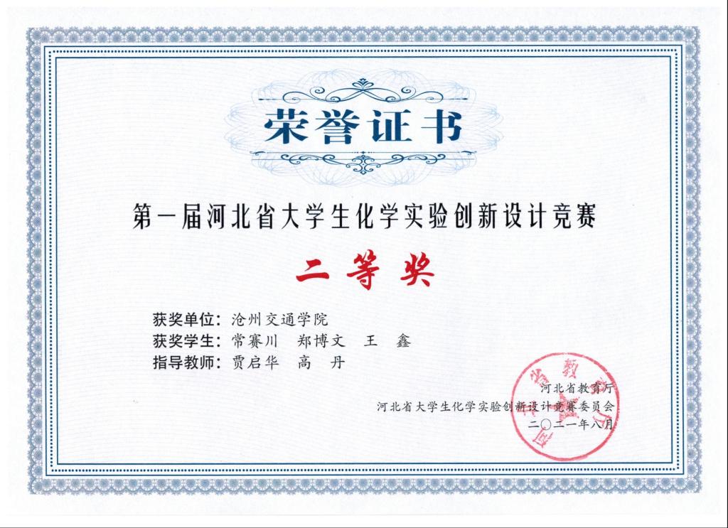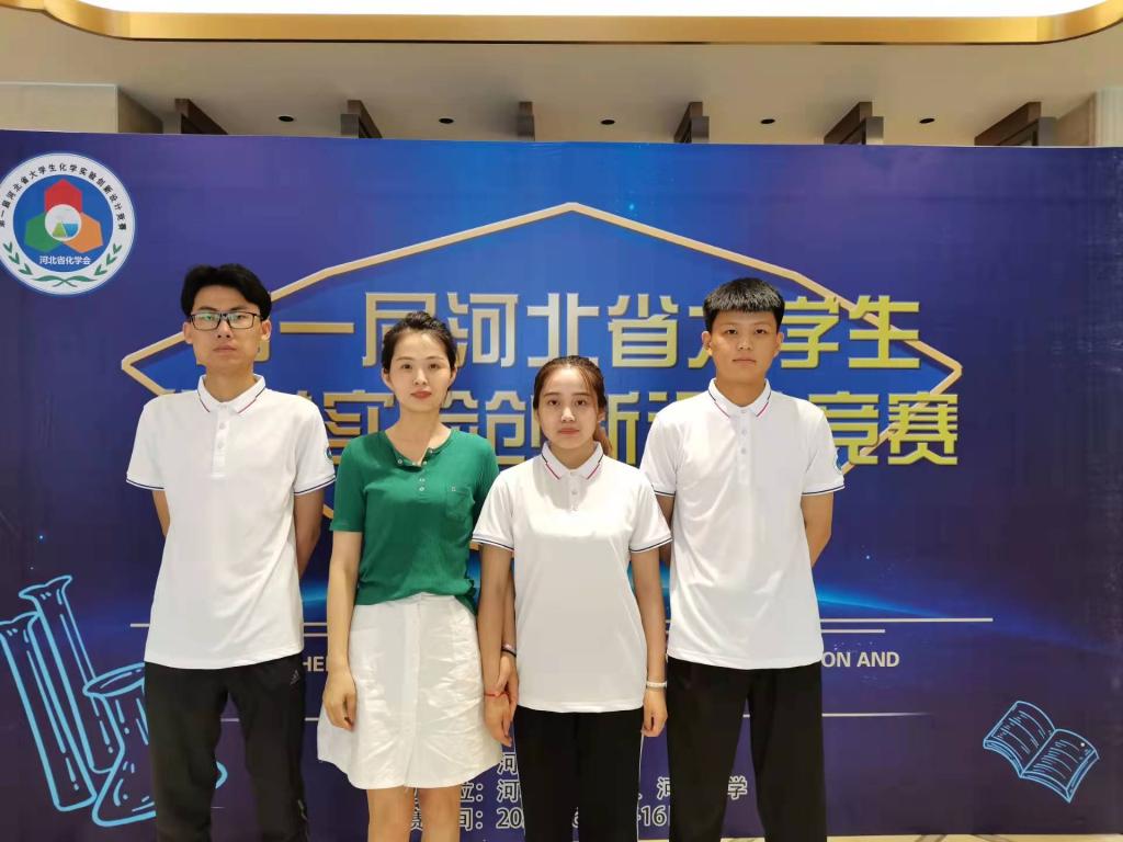 2021年第一届河北省大学生化学实验创新设计竞赛由河北省教育厅主办,河北大学与河北省化学会共同承办,旨在全面提升我省化学类专业大学生的创新意识、创新思维和创新能力。太阳官网由贾启华、高丹老师指导,2019级化工专业本科生常赛川、郑博文、王鑫同学组成的“三只小熊队”经过比赛的激烈角逐,荣获竞赛二等奖,同时太阳官网教师贾启华和高丹在本次竞赛中获评“优秀指导教师奖”。
