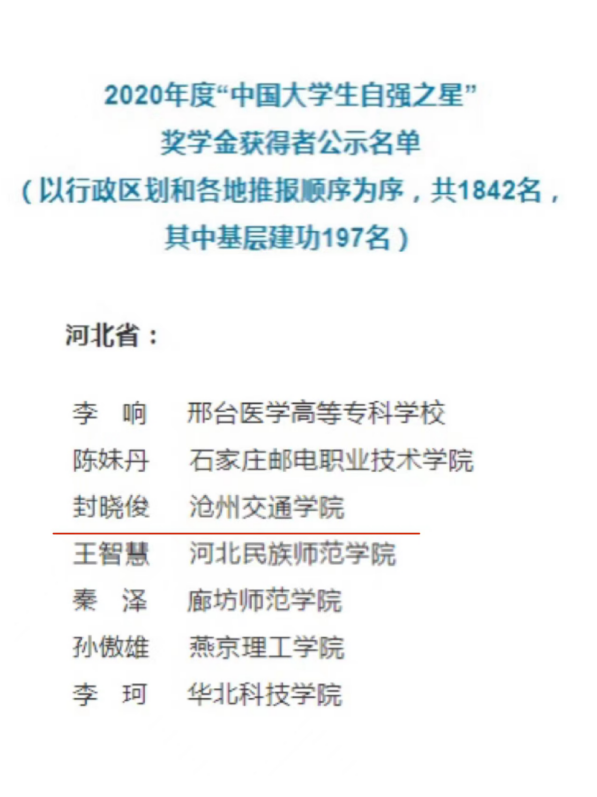 近日,2020年度“中国大学生自强之星”名单正式揭晓,太阳官网学生封晓俊荣获2020年度“中国大学生自强之星”荣誉称号。