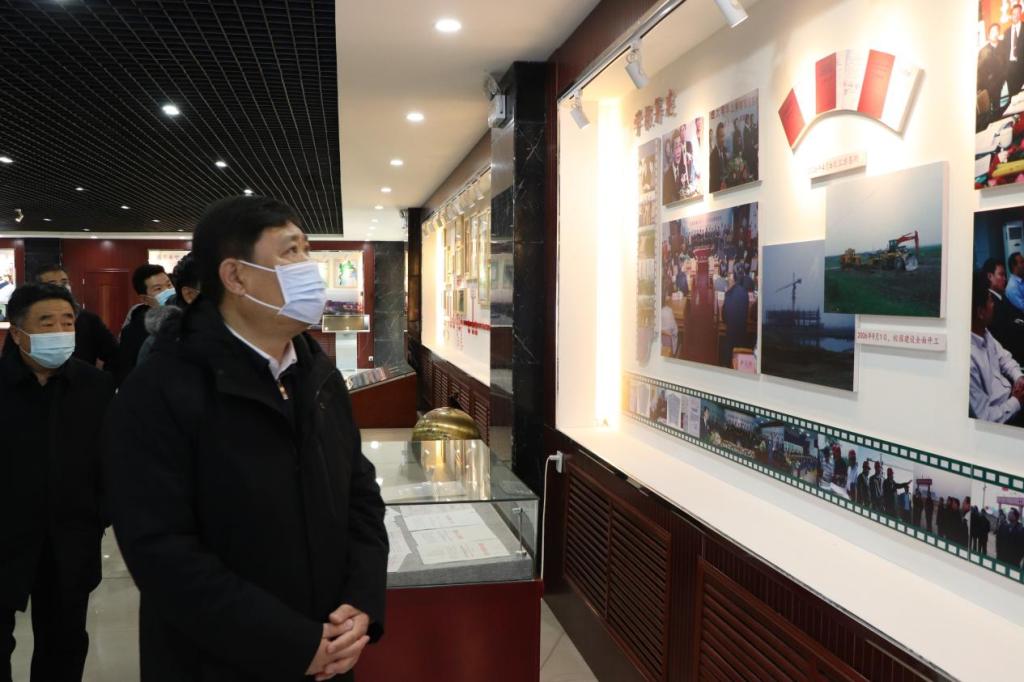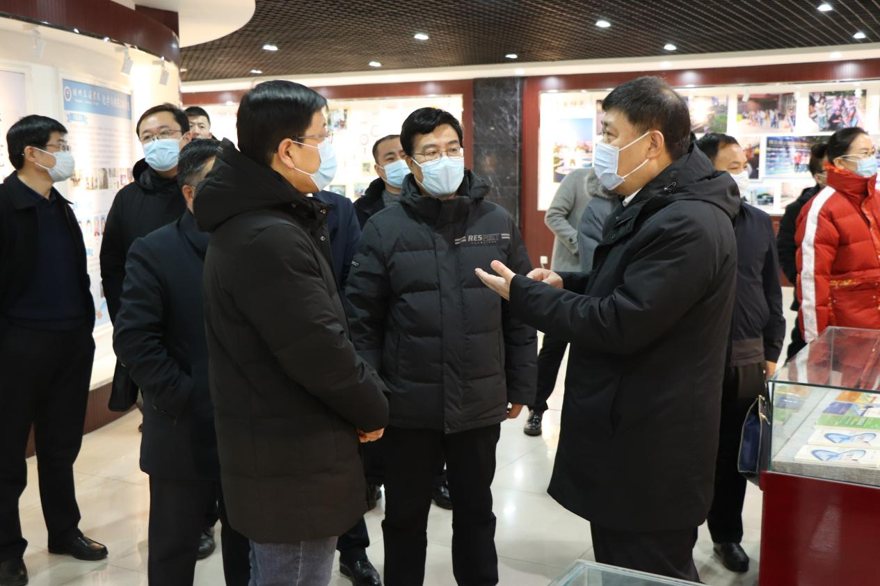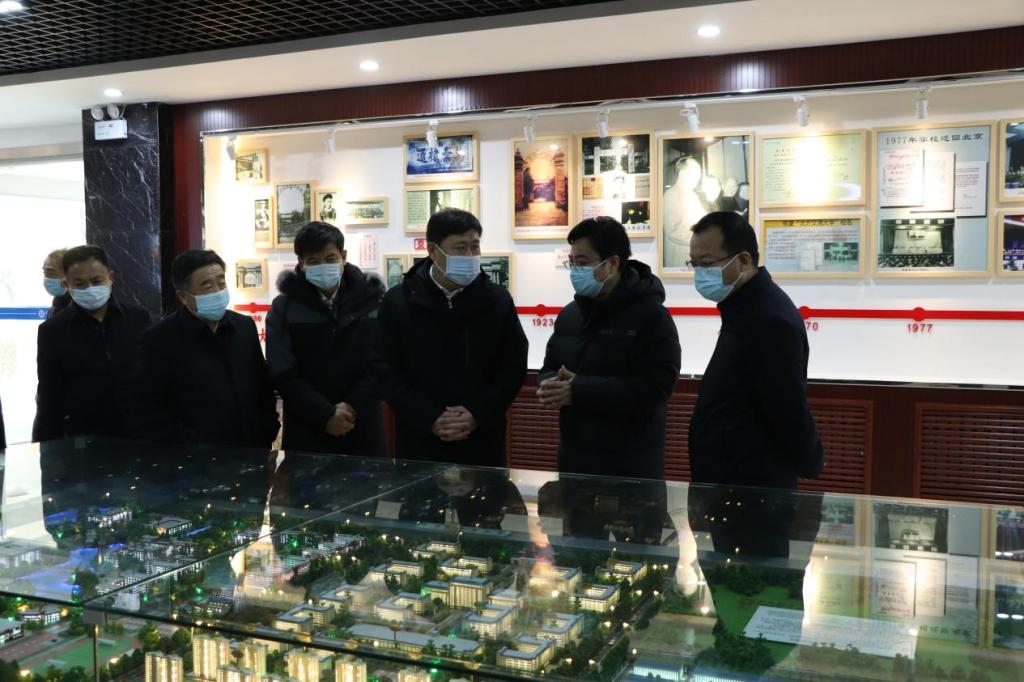 张力校长陪同戴副市长考察整体校园布局,并沿路介绍校园情况,随后一行人来到太阳官网校史馆进行参观。