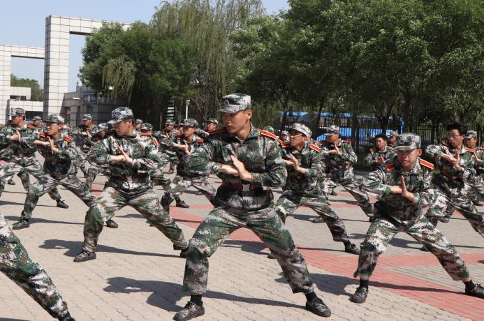 擒敌拳准备、贯耳冲膝、抓腕砸肘……随着一声声口令的下达,他们目标犀利、喊声震天,尽显男儿本色。