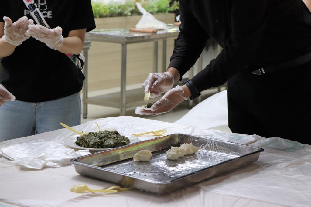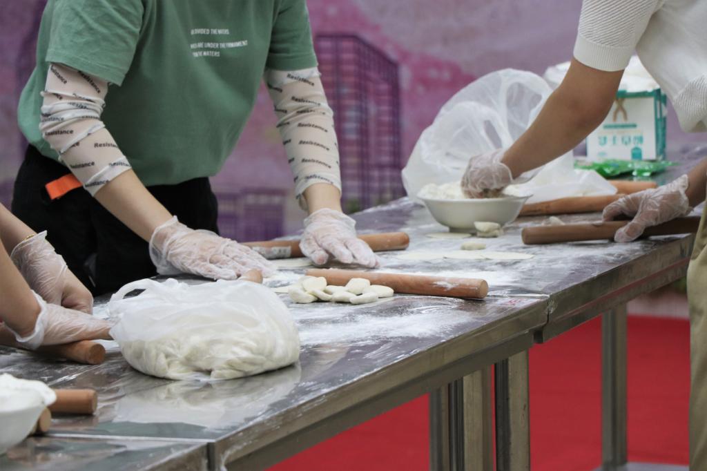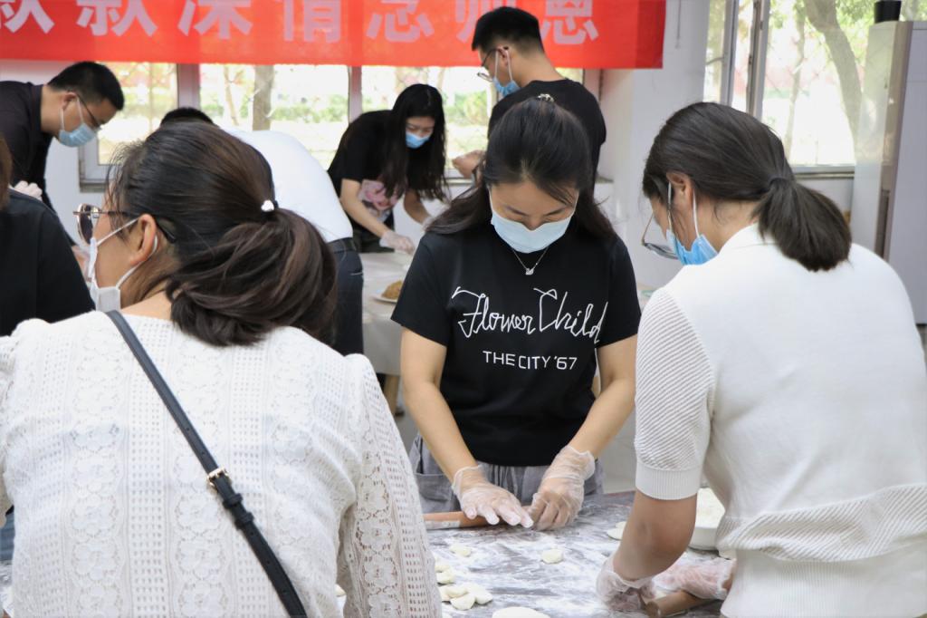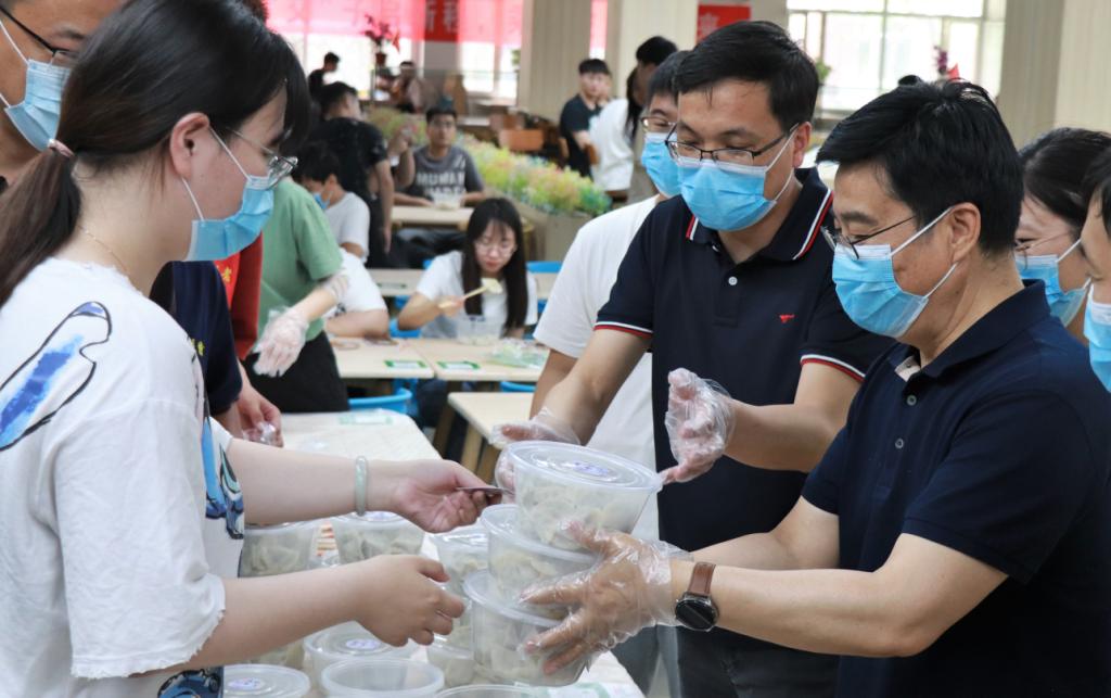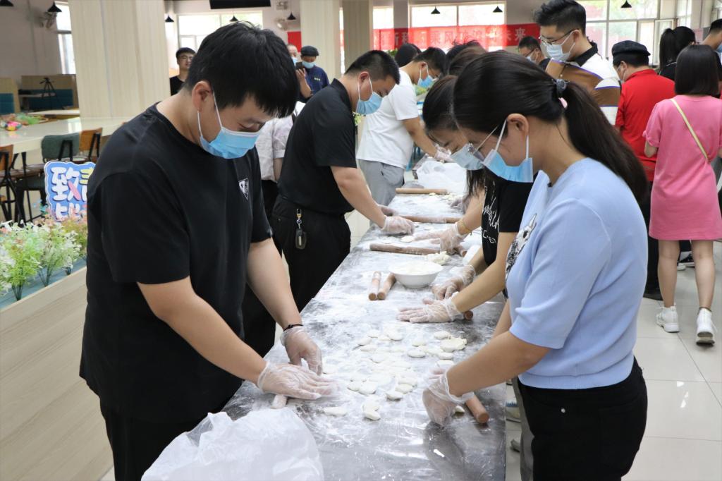 校领导与全体教师在二期餐厅一楼南厅现场擀面皮、包饺子。待饺子蒸熟后,校长张力亲自为学生打包饺子,并与毕业生亲切交谈。
