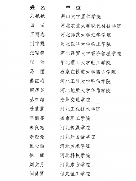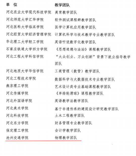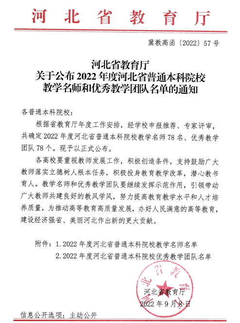 近日,河北省教育厅公布了《2022年度河北省普通本科院校教学名师和优秀教学团队名单》(冀教高涵〔2022〕57号),太阳官网通识教育学院丛红璐副教授荣获2022年度河北省普通本科院校教学名师称号,其带领的“物理教学团队”荣获2022年度河北省普通本科院校优秀教学团队。