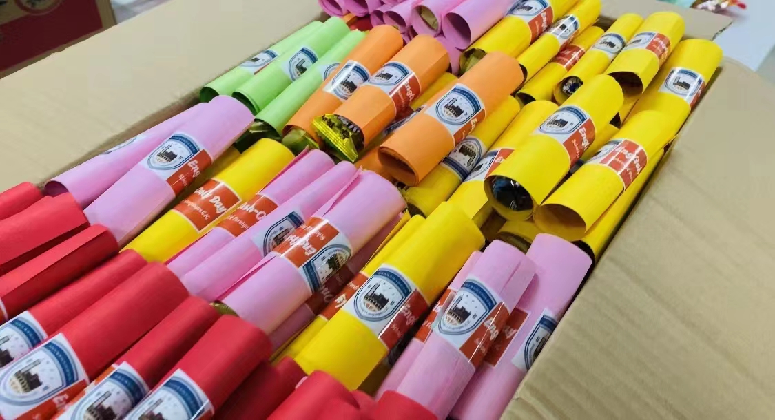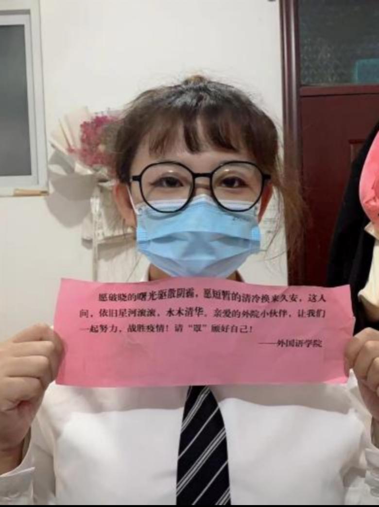 “疫情原因学校闭环管理以来,所有同学克服困难,服从学校安排,每天都配合核酸工作的展开,但当一件事情很机械地去重复做的时候,大家的心情肯定是挺沉闷的。所以在校领导的大力支持下,我们当日就落实了这个想法,心意虽小,却是情意满满,希望以此表达对同学们的关心与关爱,鼓励同学们珍惜时光、扎实学识,同心战疫、共克时艰,共迎春暖花开!”外国语学院团委书记周志慧表示。