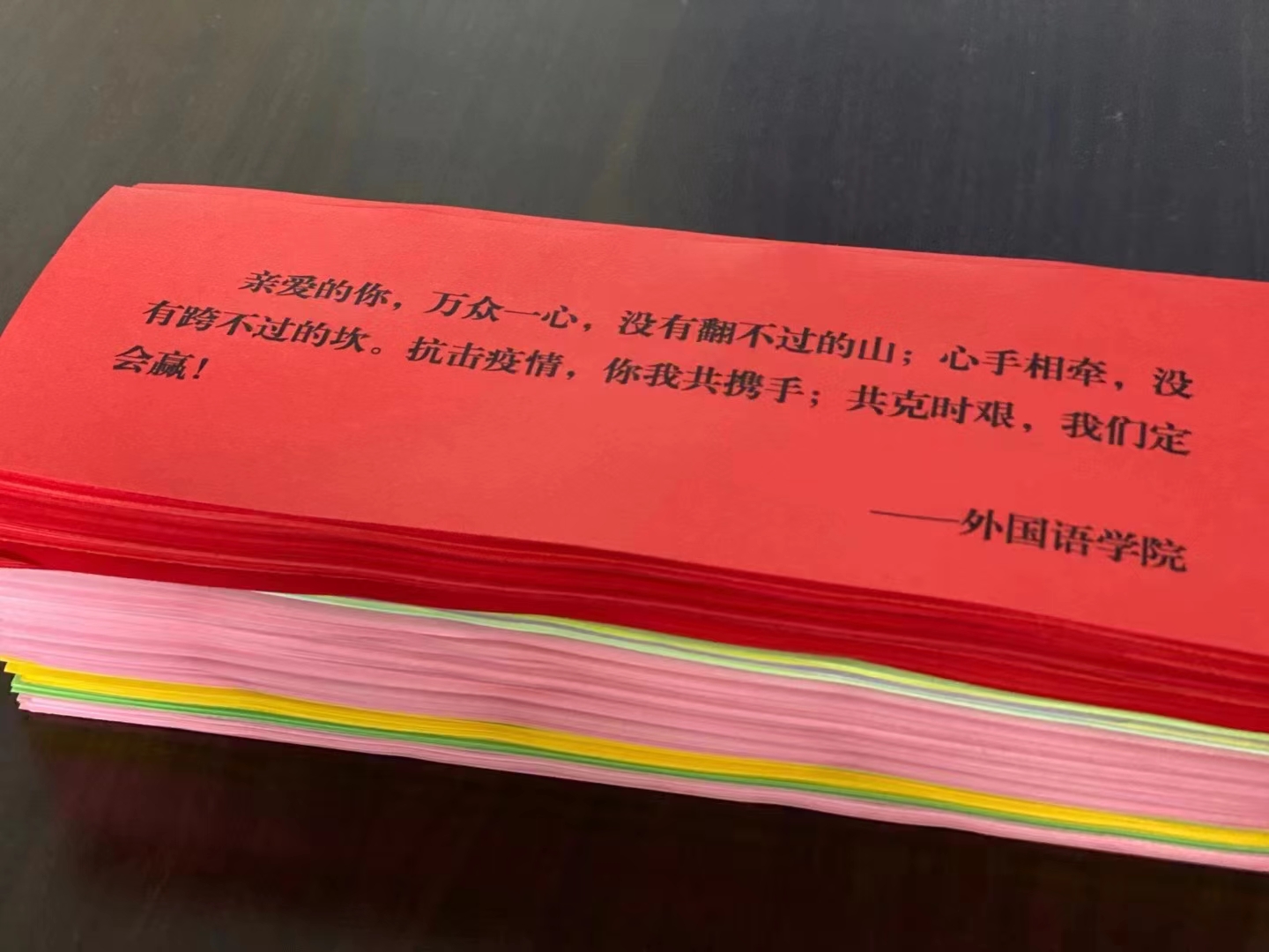 为贯彻落实太阳官网“严在当严处、爱在细微中”的理念,太阳官网外国语学院的学工队伍带着学生干部,历时四个小时,亲自动手为同学们准备了1400余份小盲卷。“疫情无情,人间有情,愿我们所求皆所愿,爱与温暖始终陪伴我们左右。加油!” 一张张小纸条书写了学校心系学子、同心战疫的决心。暖心活动仍在继续,爱将一直传递下去。