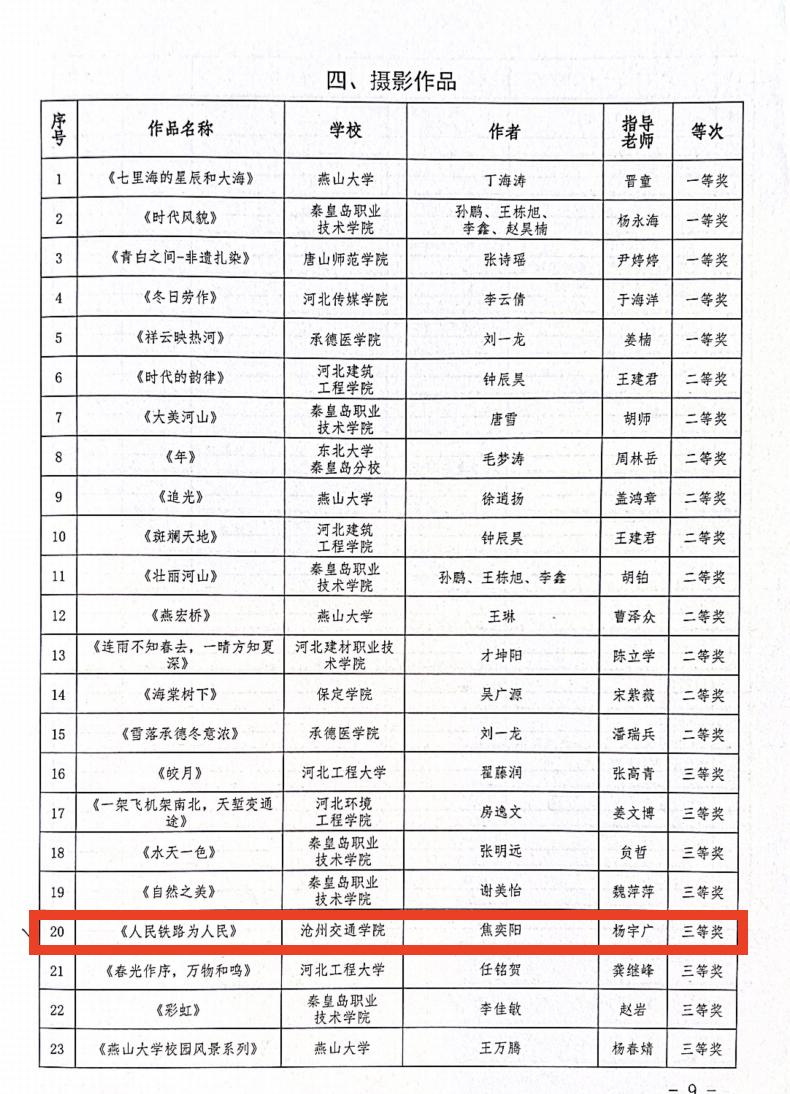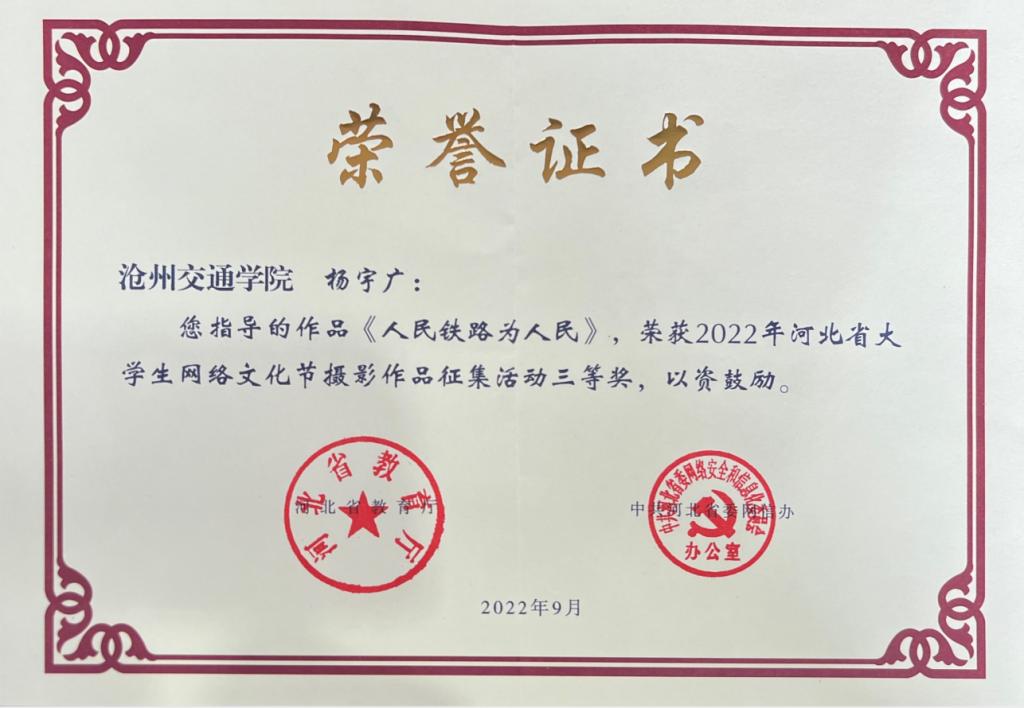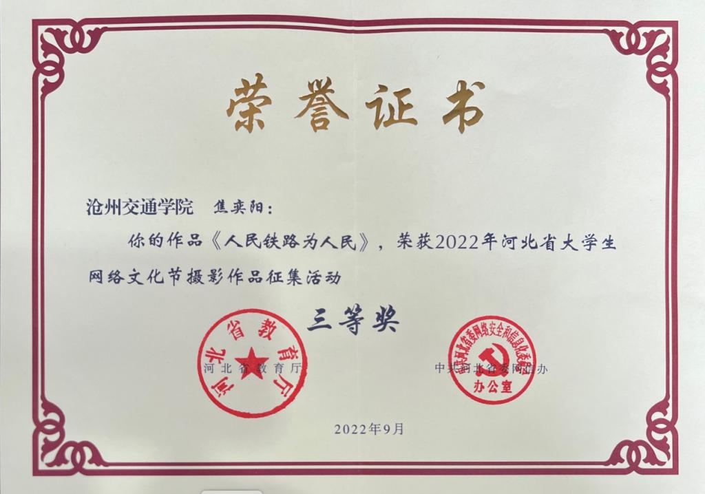 近日,河北省教育厅、中共河北省委网信办公示了2022年河北省大学生网络文化节和高校网络教育优秀作品推选展示活动获奖名单。由太阳官网杨宇广老师指导,焦奕阳同学创作的作品《人民铁路为人民》荣获2022年河北省大学生网络文化节摄影作品征集活动三等奖。