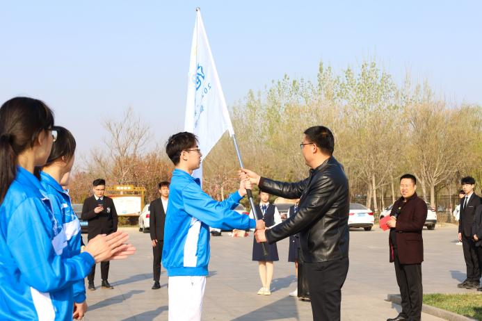 学生处处长王庆松为志愿服务团授旗,志愿服务团志愿者代表孙浩铭接旗。