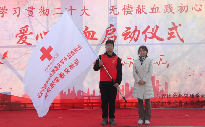 河北省红十字无偿献血志愿服务支队、沧州市大队办公室副主任、沧州市中心血站献血招募办公室副主任陈靖宇授旗,青年志愿者服务团团长曾宪汪同学接旗。