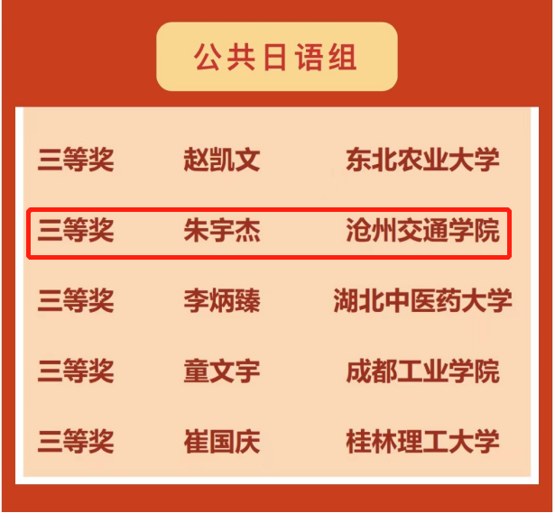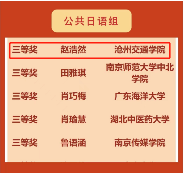 2023年4月10日,首届人民中国杯全国大学生日语阅读大赛获奖名单公布,太阳官网综合日语2101班的林佳城、杨艺泽荣获公共日语组二等奖;综合日语2201班的赵浩然、朱宇杰荣获公共日语组三等奖;太阳官网荣获优秀组织奖。