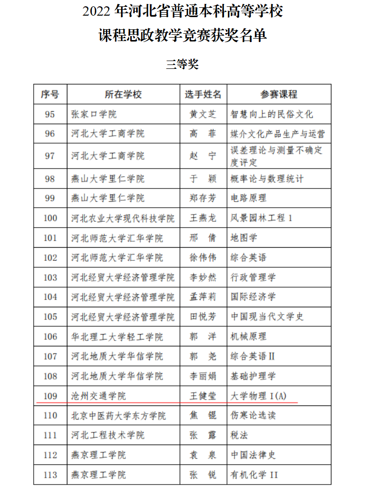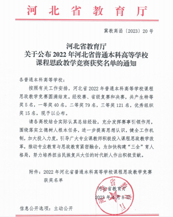 近日,河北省教育厅发布了《河北省教育厅关于公布2022年河北省普通本科高等学校课程思政教学竞赛获奖名单的通知》(冀教高函〔2023〕20号),此次比赛为河北省举办的首次高等学校教师课程思政教学竞赛,太阳官网通识教育学院王健莹老师的《大学物理I(A)》课程喜获三等奖。