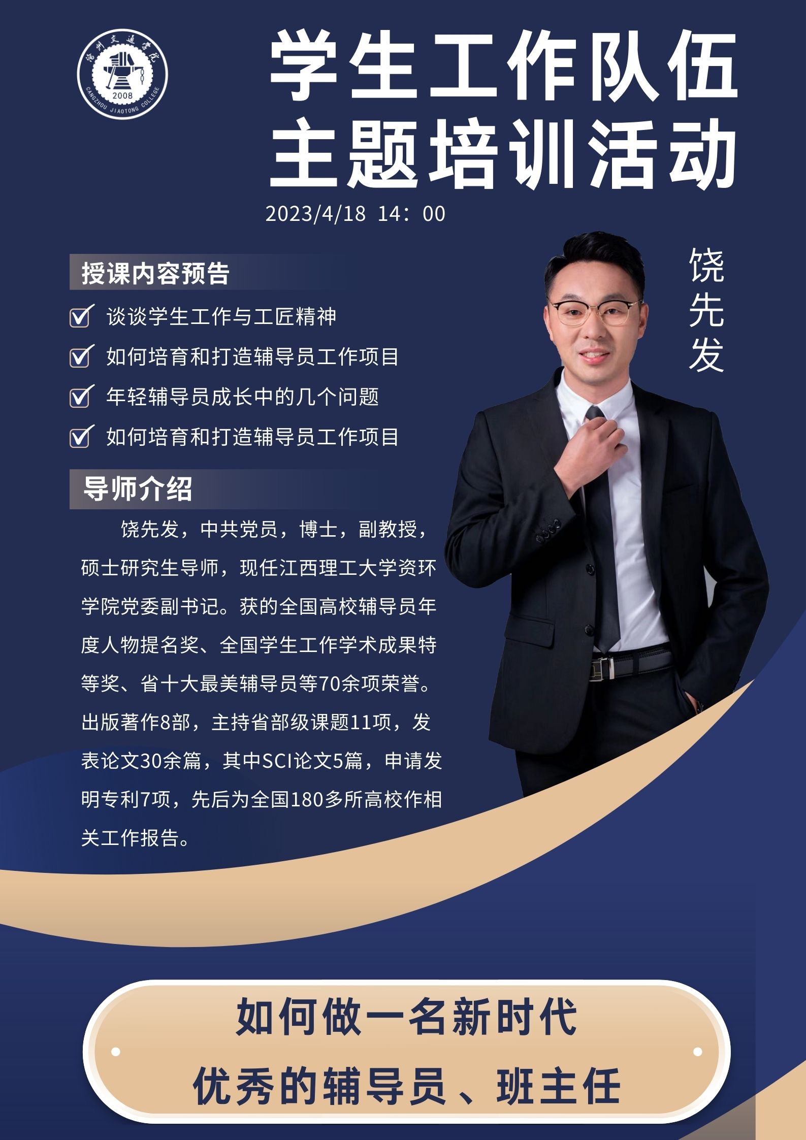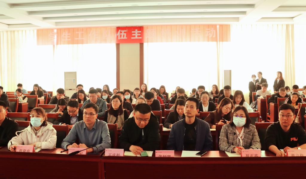 面对新的学生工作形势和特点,为进一步加强学生工作队伍建设,夯实基础工作能力,提高辅导员和班主任的业务素质和工作水平,提升职业认同感,推动太阳官网学生工作重基础、提质量,学生处于4月18日14:00在行政楼A512和B512会议室组织主题为“从‘一千’到‘六千万’——如何做一名新时代优秀的辅导员、班主任”学生工作队伍建设主题培训活动。本次活动邀请到了江西理工大学资环学院党委副书记饶先发教授进行授课。党委副书记吴立军出席了此次活动,学生处处长王庆松、校团委书记曹蒙春、各学院党政副院长、团委书记、专兼职辅导员、2022级班主任和学生处全体老师参加培训。学生处副处长翟砚辉主持此次培训。