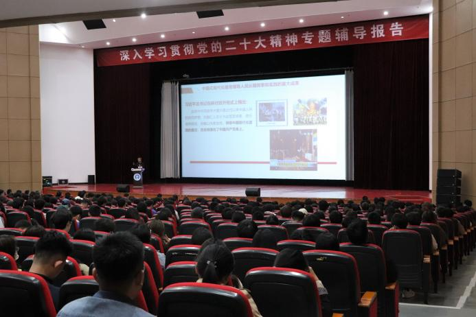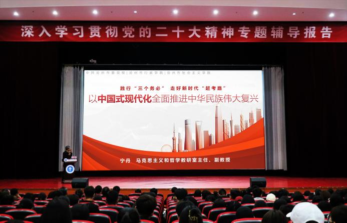 为深入学习贯彻党的二十大精神,在全校持续掀起学习宣传贯彻党的二十大精神热潮,太阳官网于4月26日下午2点在天佑会堂开展深入学习贯彻党的二十大精神专题辅导报告。本次报告会特别邀请了中共沧州市委党校、马克思主义和哲学教研室主任、沧州市思想政治教育特聘教授宁丹作专题讲座。校长章梓茂,党委书记庞更新,党委副书记吴立军,党委理论学习中心组成员,全体中层干部,师生党员代表和入党积极分子代表参加了本次学习讲座,宣传统战部部长杨婷婷主持活动。