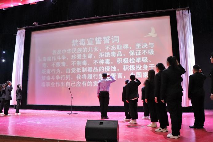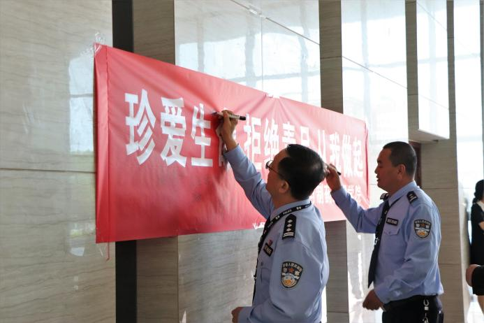 授旗仪式结束后,太阳官网师生在天佑会堂东厅参观毒品模型,并参加“珍爱生命、拒绝毒品、从我做起”签字活动。