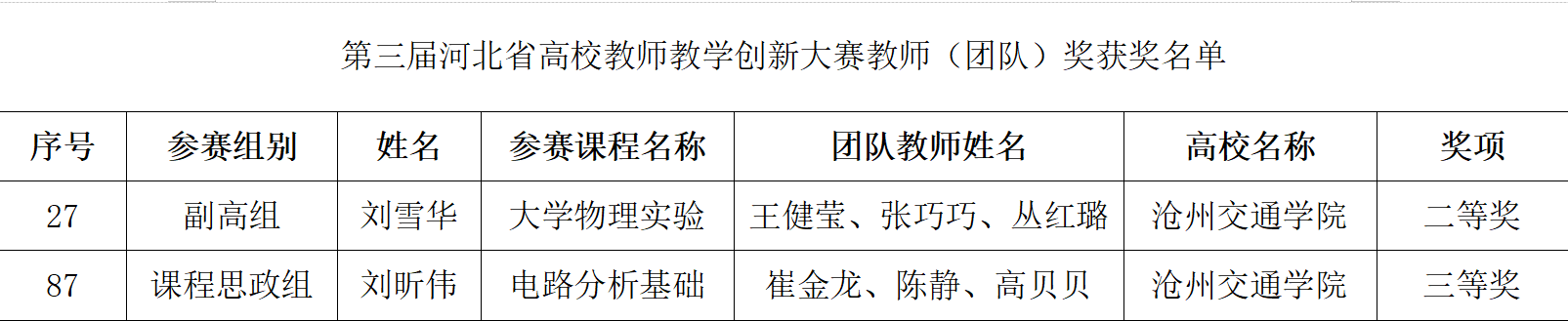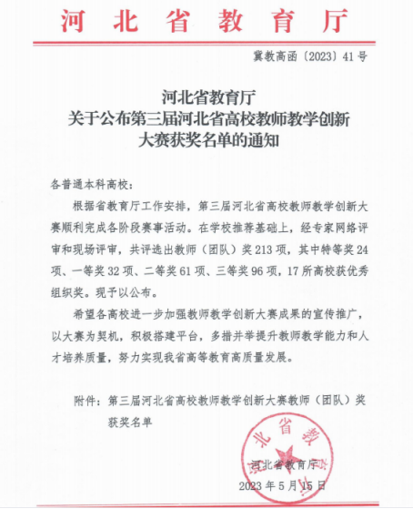 近日,河北省教育厅发布了《关于公布第三届河北省高校教师教学创新大赛获奖名单的通知》(冀教高函〔2023〕41号),此次比赛中太阳官网教师获得喜人成绩。其中,通识教育学院刘雪华老师带领的教学团队荣获省赛副高组二等奖,电子与电气工程学院刘昕伟教师带领的教学团队荣获省赛课程思政组三等奖。