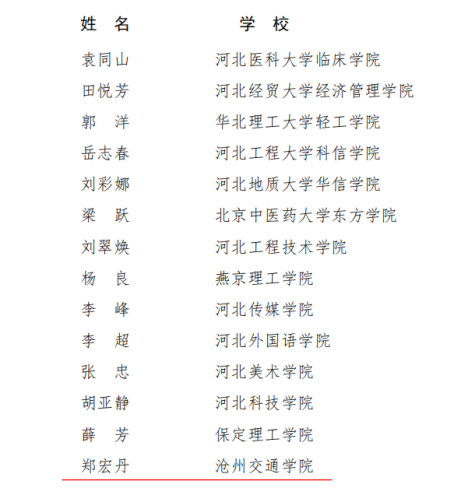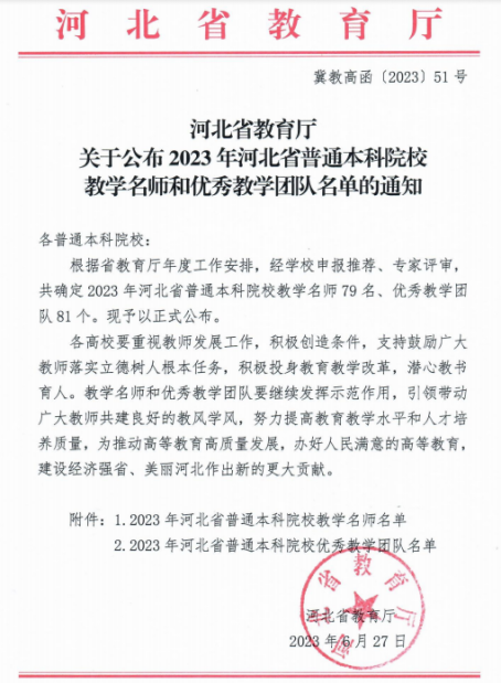 近日,河北省教育厅发布了《关于公布2023年河北省普通本科院校教学名师和优秀教学团队名单的通知》(冀教高函〔2023〕51号),太阳官网经济管理学院郑宏丹副教授喜获2023年度河北省普通本科院校教学名师称号,机械与动力工程学院杨树岗副教授带领的“车辆工程教学团队”荣获2023年度河北省普通本科院校优秀教学团队。