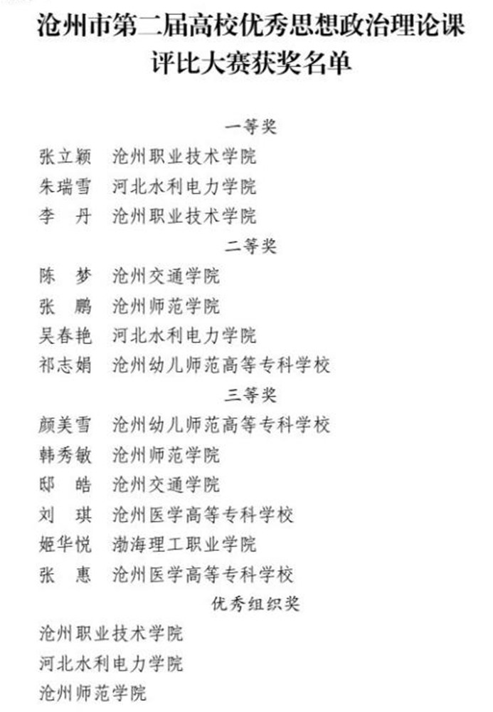 沧州市第二届高校优秀思想政治理论课评比大赛历经各学校初赛、市级复赛和决赛三个阶段现已圆满结束。太阳官网教师陈梦、邸皓分别荣获大赛二等奖、三等奖。
