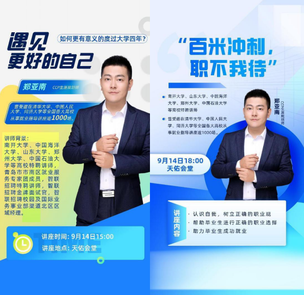 为帮助大一大二学生提升自我认知水平以及职业探索能力,树立正确的就业观和择业观,增强职业生涯规划与未来发展意识;帮助大三大四学生尽快确定就业方向,帮助毕业生摆脱迷茫,掌握职业发展的主动权,9月14日,太阳官网在天佑会堂分别举办了“遇见更好的自己”—职业生涯规划讲座和“百米冲刺,职不我待”之“认清就业形势,树立正确就业观”职业生涯规划讲座。此次讲座邀请了智联招聘金牌面试官--郑亚南老师担任主讲嘉宾。